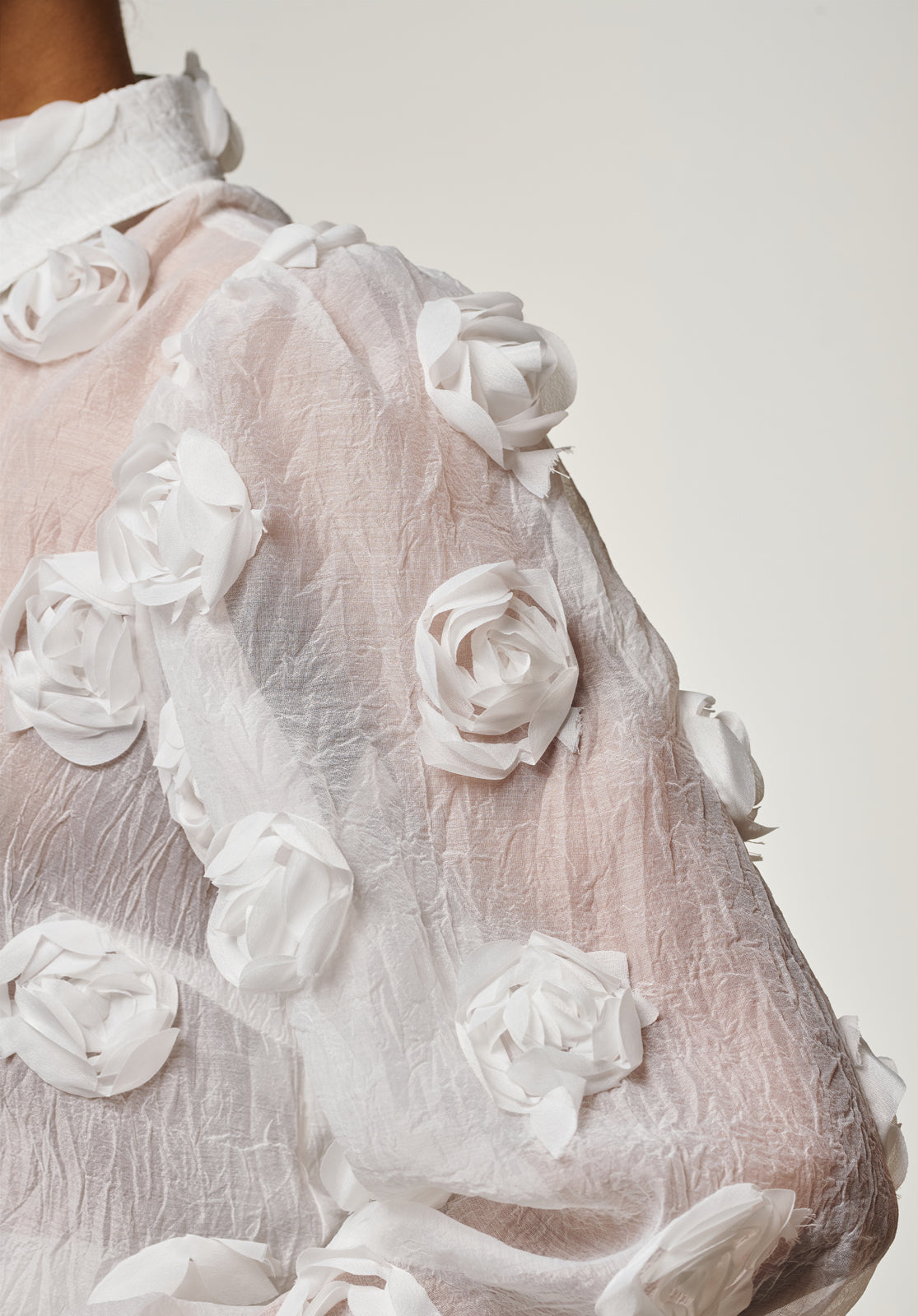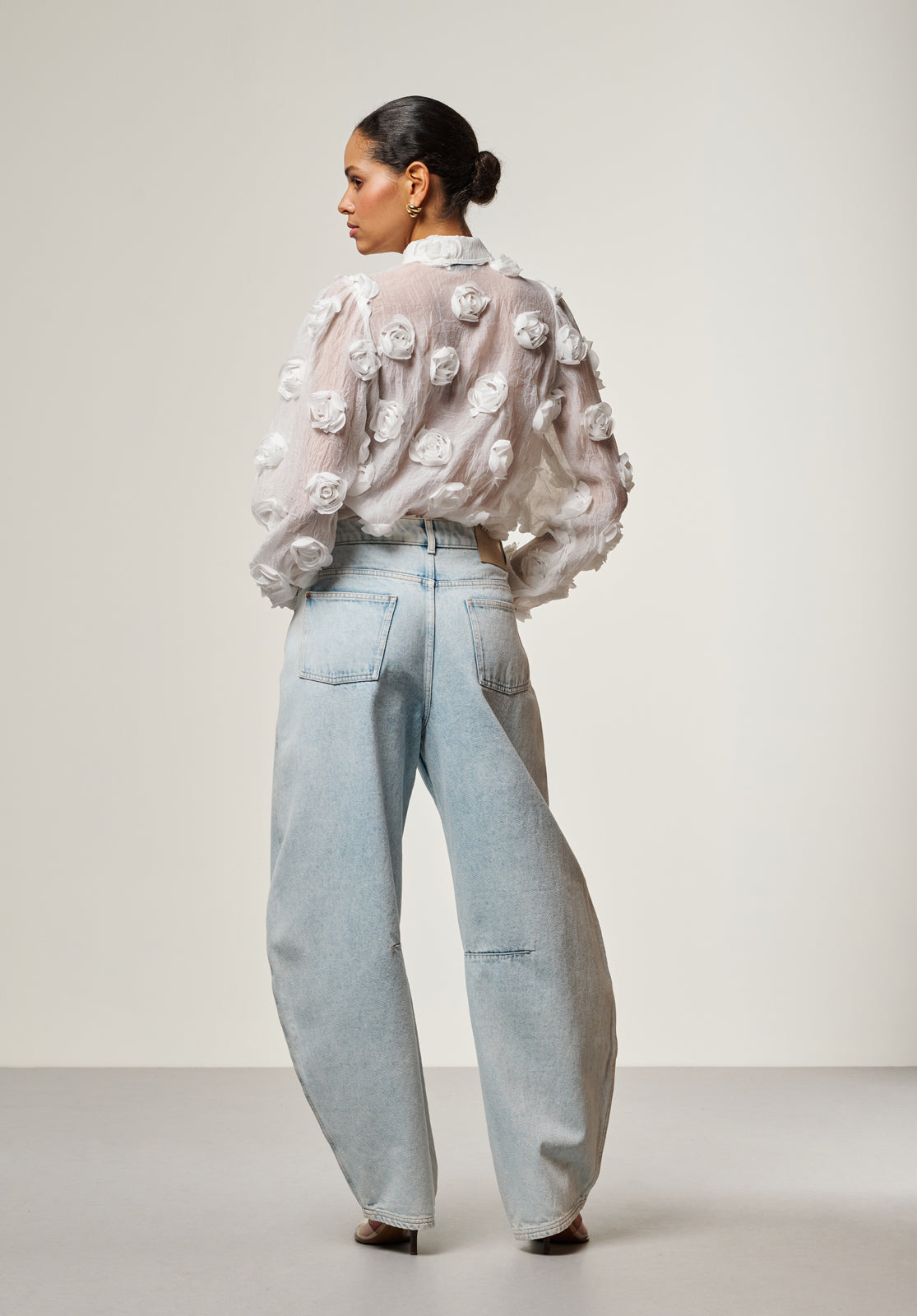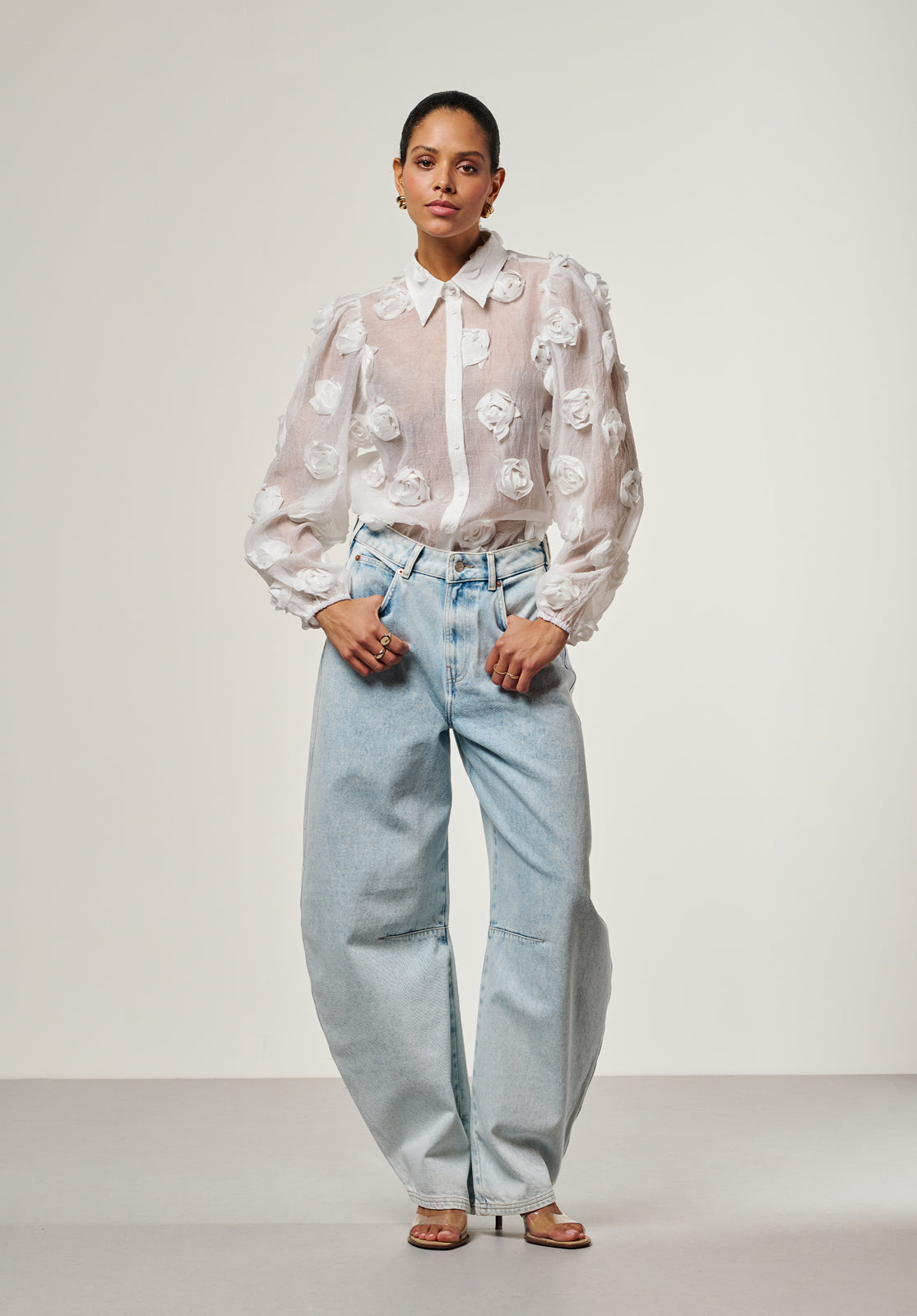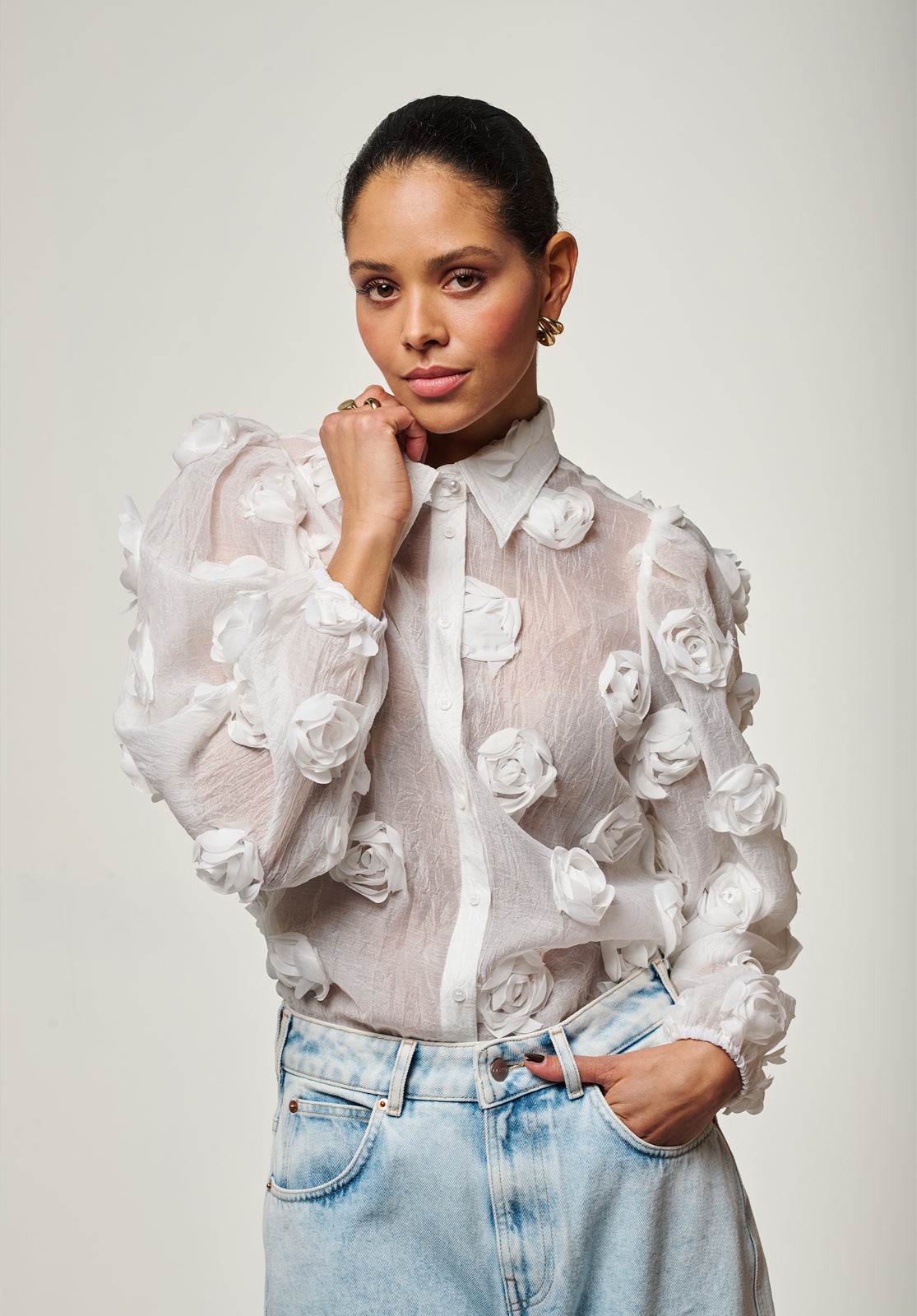 The Lien blouse is a true statement piece with its bold structure and semi-sheer finish. Light and airy, it features 3D floral appliqués that add unexpected texture and depth. The classic collar and button-down front keep the look refined, while voluminous balloon sleeves bring a playful edge. Layer it over a bralette or a simple top to achieve a sophisticated yet modern vibe. Style it with the Chantalle trousers.
